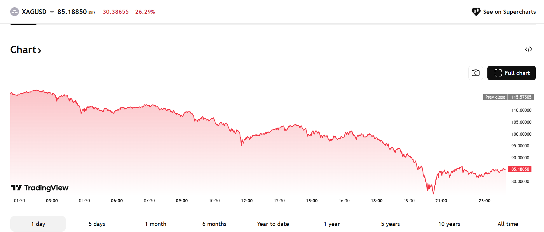 XAG/USD在周四曾突破120美元,周五的激进获利了结行为引发价格回落,并带动整个贵金属板块广泛回调。 Trading View数据显示,XAG/USD当前交易价格位于85美元上方,过去24小时内跌幅超26%。在1月30日暴跌约35%跌破75美元后,现货白银价格于31日小幅回升。