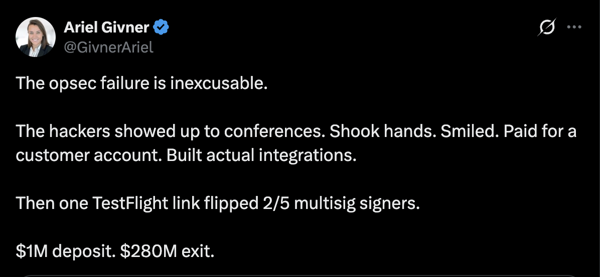 “每个严肃的项目都知道这一点。但Drift没有遵守,”她补充道,“他们知道加密货币领域充斥着黑客,尤其是朝鲜的国家级团队。”吉夫纳继续说道:“然而,他们的团队花了数月时间在Telegram上聊天,在会议上与陌生人会面,打开可疑的代码仓库,并在与多重签名控制相关的设备上下载虚假应用程序。”