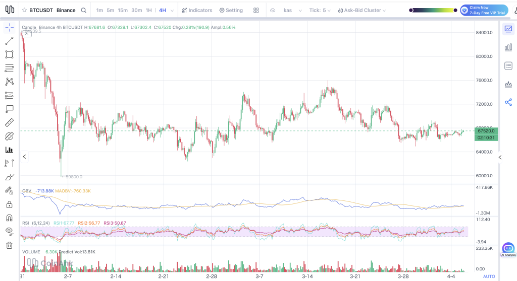 观察比特币图表会发现一个微妙的时间节点。在经历二月暴跌强势反弹后,比特币曾试图突破76,000美元未果,这在图表上形成更低的高点。此后价格持续在67,000至68,000美元区间横盘整理。