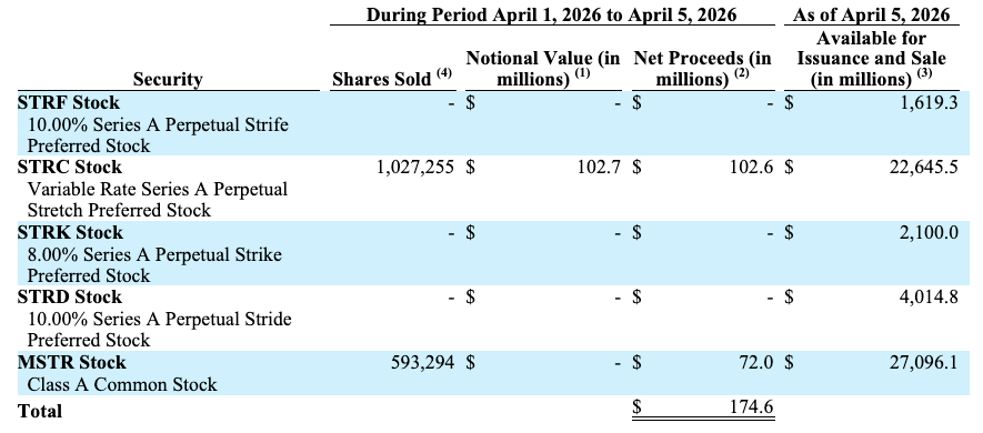 在3月30日至31日期间,策略公司售出了约228万股STRC股票和582,550股MSTR股票,获得了约2.993亿美元的净收益。在4月1日至5日期间,公司又额外售出了100万股STRC股票和593,294股MSTR股票,筹集了约1.746亿美元。
