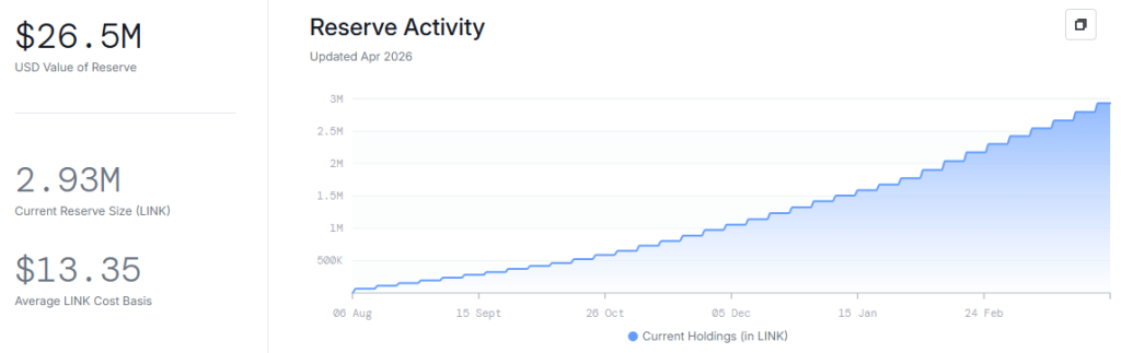 与此同时,Chainlink储备正悄然积累。截至4月2日,已通过链上与链下收入流累计293万枚LINK。这不是散户投机,而是系统性积累。