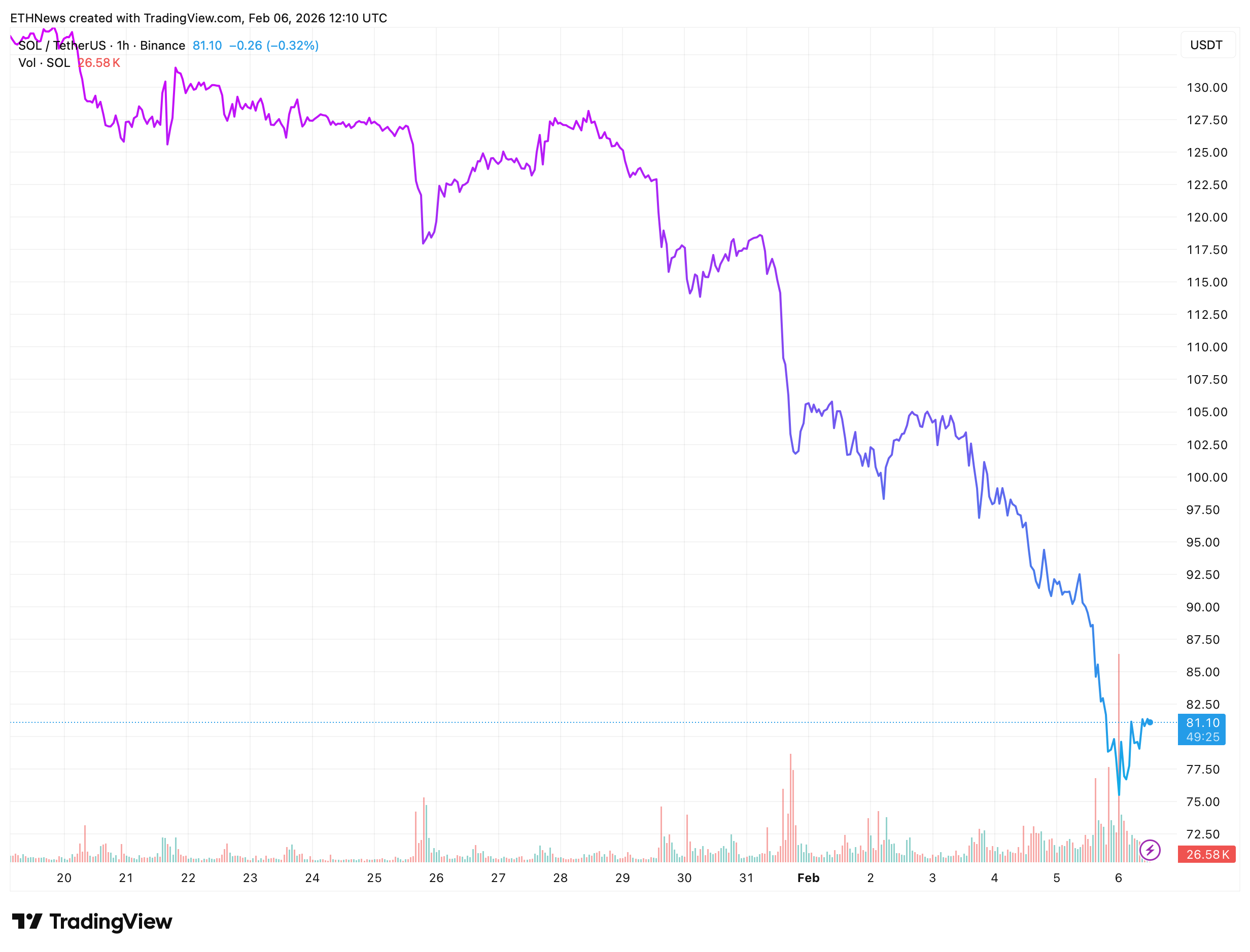在1小时SOL/USDT图表上,Solana当前交易于81美元附近,此前一周内价格从120-125美元区域急剧下挫。此轮下跌走势凌厉且方向明确,期间几无整理。