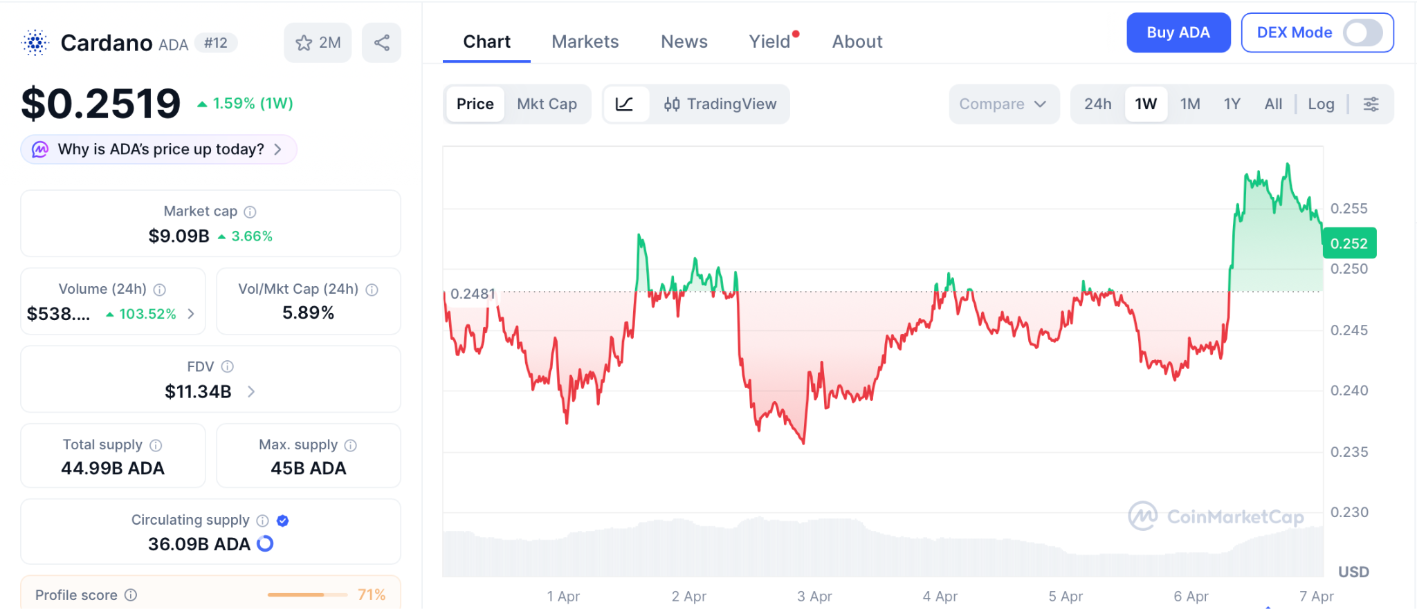 据CoinMarketCap数据,ADA现报0.2519美元。协议第11版升级临近,叠加去年11月以来首现的交易所流入信号,共同预示行情波动。CoinCodex预测2026年中目标价0.38美元,Changelly则给出4月0.307-0.412美元区间预期。