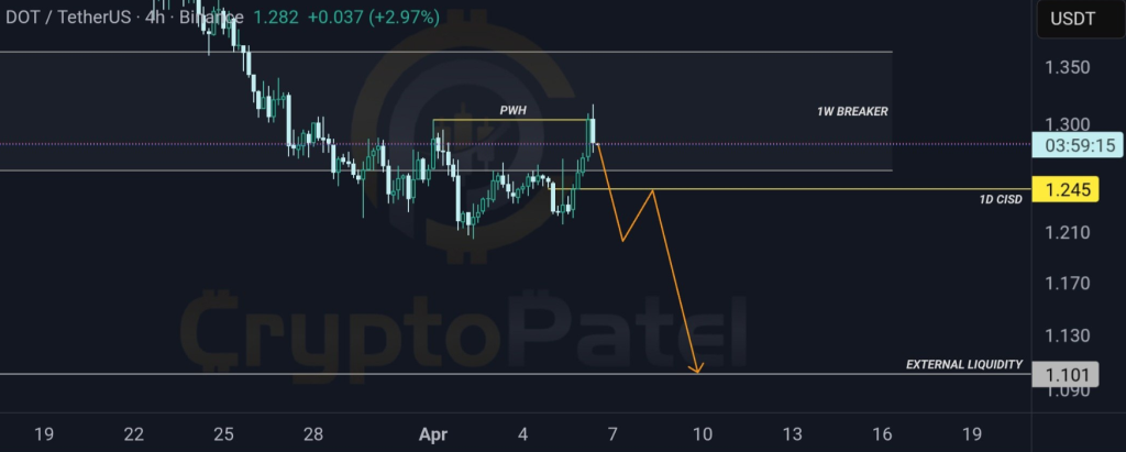 由于更高时限持续走出更低高点,整体结构维持看跌。当前价格走势显示DOT正转向近期低点下方的卖方流动性区域,强化了趋势延续的论断。