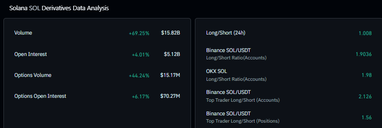 Solana此轮上涨的真正故事藏在衍生品市场中。数据显示,其期货交易量激增69%至158.2亿美元,未平仓合约量攀升至51.2亿美元上方,表明新资金正在入场。与此同时,期权交易量跃升44%以上,强化了市场波动性将加剧的预期。