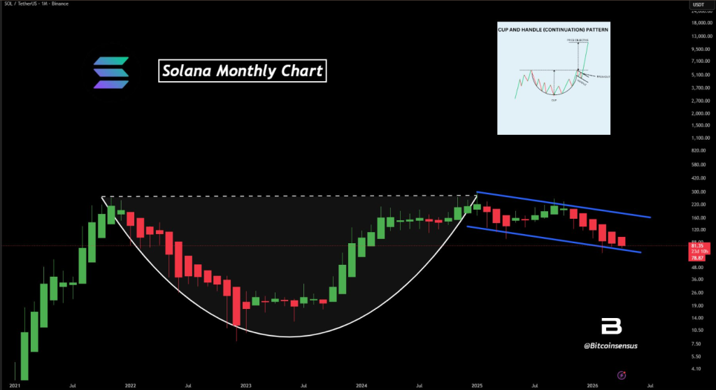 从更宏观视角看,Solana的长周期框架结构正开始吸引机构关注。月线图显示,经过长期积累阶段已构筑出大型杯状形态,而当前价格走势在受控下降通道内运行,正在关键阻力下方形成杯柄结构。