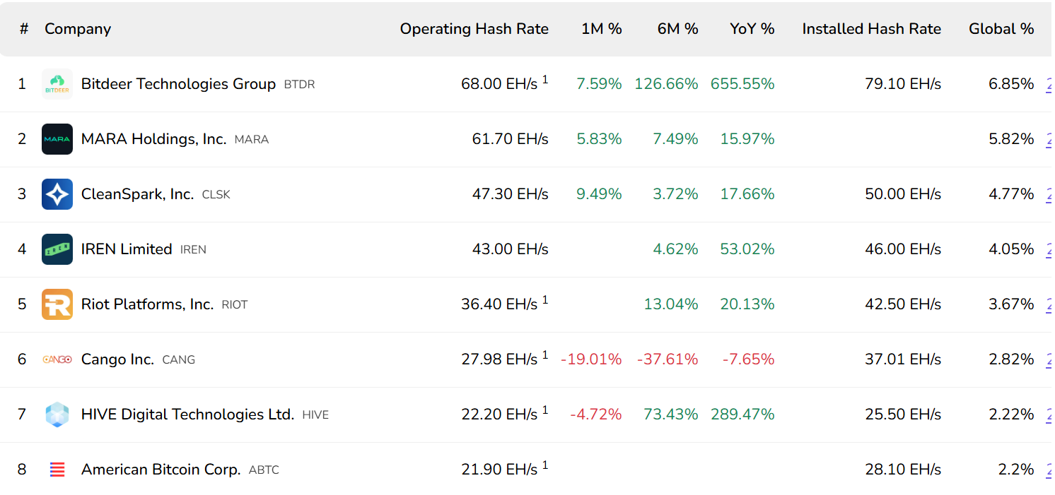 按算力排名的顶尖比特币矿企。数据来源:BitcoinMiningStock
