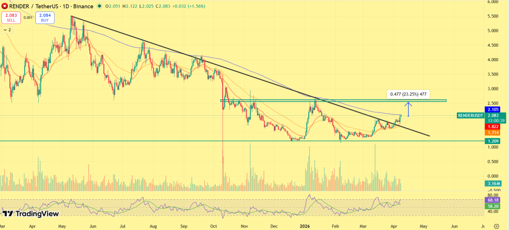 随着看涨情绪蔓延至整个市场,Render在此轮加密资产上涨中表现突出,涨幅超过10%,交易价格逼近2.07美元。这一走势由宏观利好与项目自身催化剂共同推动。在比特币突破高位、流动性涌入高增长叙事板块的背景下,如RNDR这类聚焦人工智能的代币正吸引大量资金流入。随着RNDR价格逼近关键阻力区,市场焦点迅速转移:RNDR是否正蓄力突破,准备向2.50美元进发?