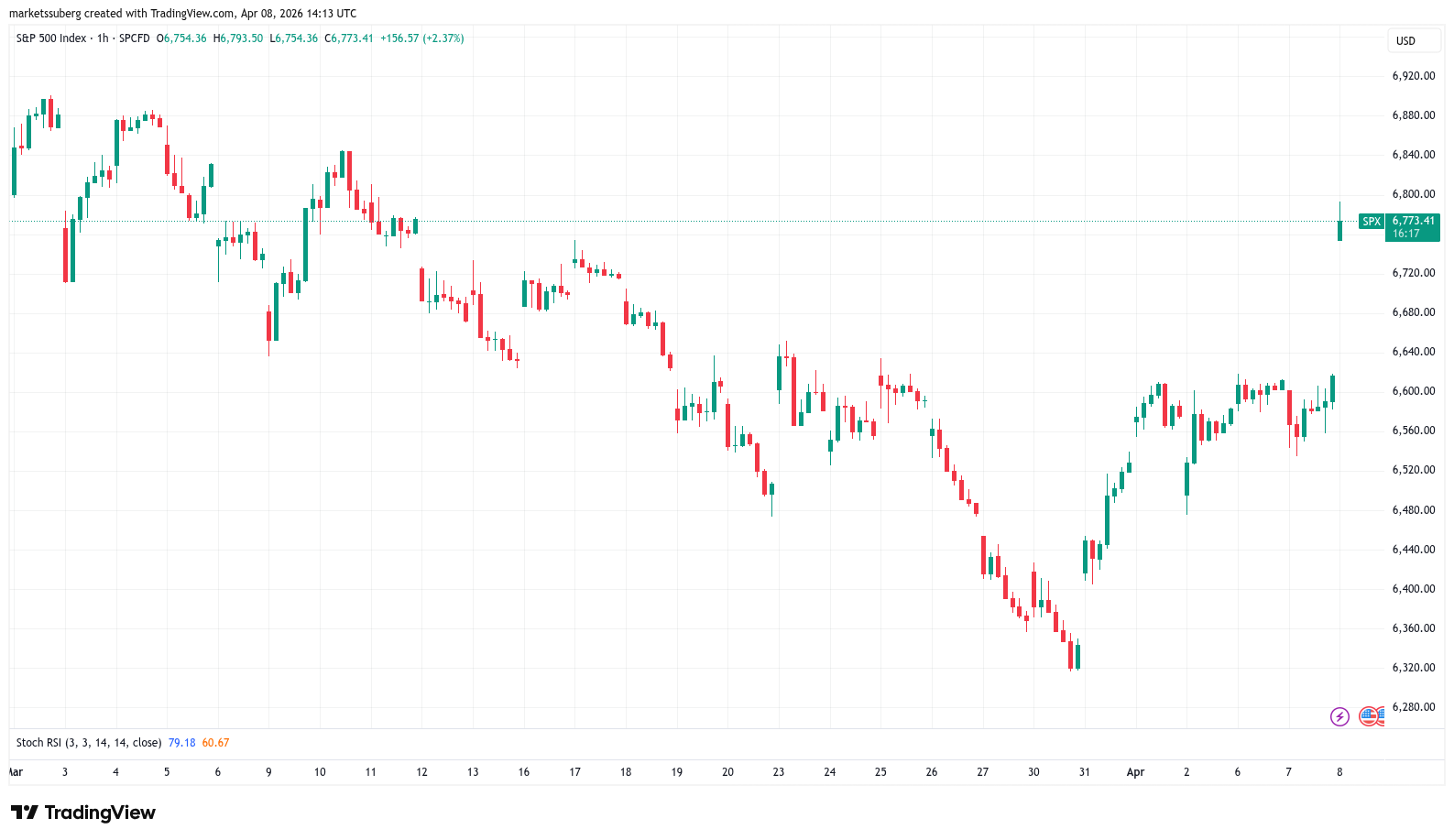 美国、以色列和伊朗之间达成至少为期两周的停火协议,消息瞬间推高风险资产,标普500指数开盘涨幅超过2.5%。