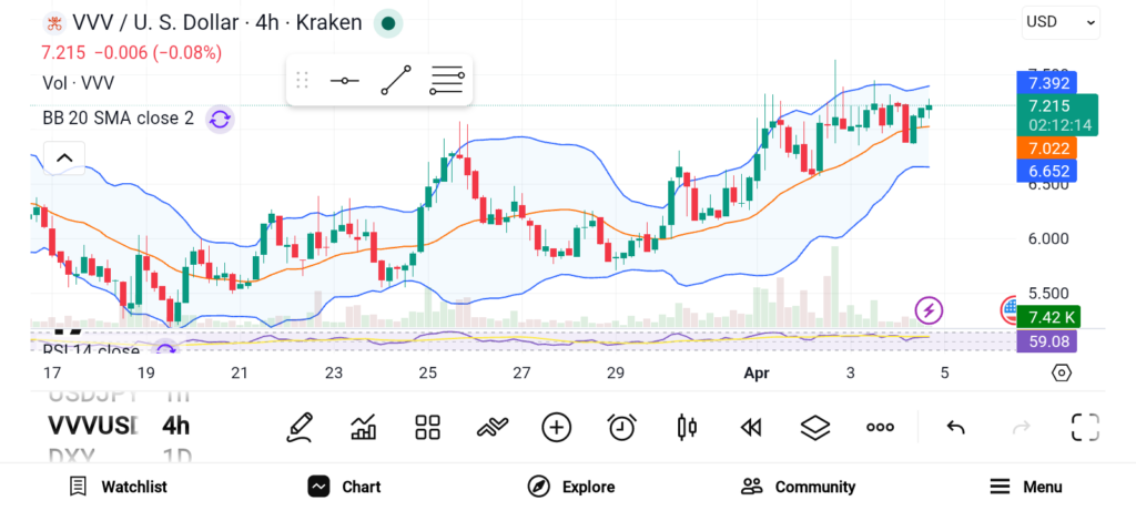Venice Token 作为聚焦人工智能的资产,持续获得市场关注。本周价格上涨约18%。需求保持稳定,买家在回调时介入。图表显示在强劲上涨后形成了一个清晰的看涨旗形。价格目前在一个狭窄区间内运行,形成更高的低点。这种形态通常意味着趋势的延续而非走弱。买家在阻力位下方吸收了卖压,这强化了看涨结构。VVV 交易于7.0美元至7.2美元区域附近。该区域是关键阻力位。若突破此区间,可能引发向10美元至12美元的上涨。若未能突破,则可能导致价格回落至6.0美元至5.4美元区域。该区域此前曾吸引强劲需求。