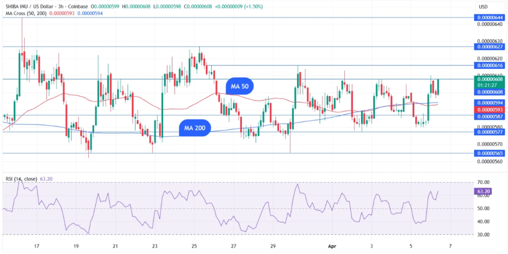 日线图上出现了蜻蜓十字星,预示着在持续下行压力后可能出现的看涨反转。在此形态之后,柴犬币攀升至其50日移动均线上方,并达到了更高的日内水平。