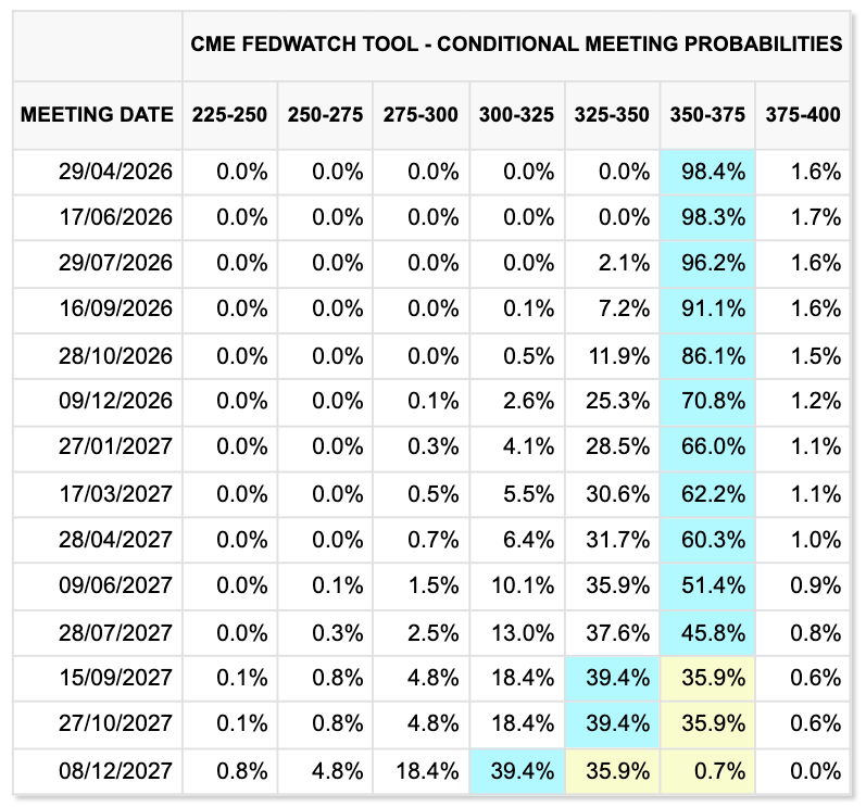 市场对美联储未来政策仍持谨慎态度,CME Group的FedWatch工具数据显示,市场仍不预期2026年会降息。