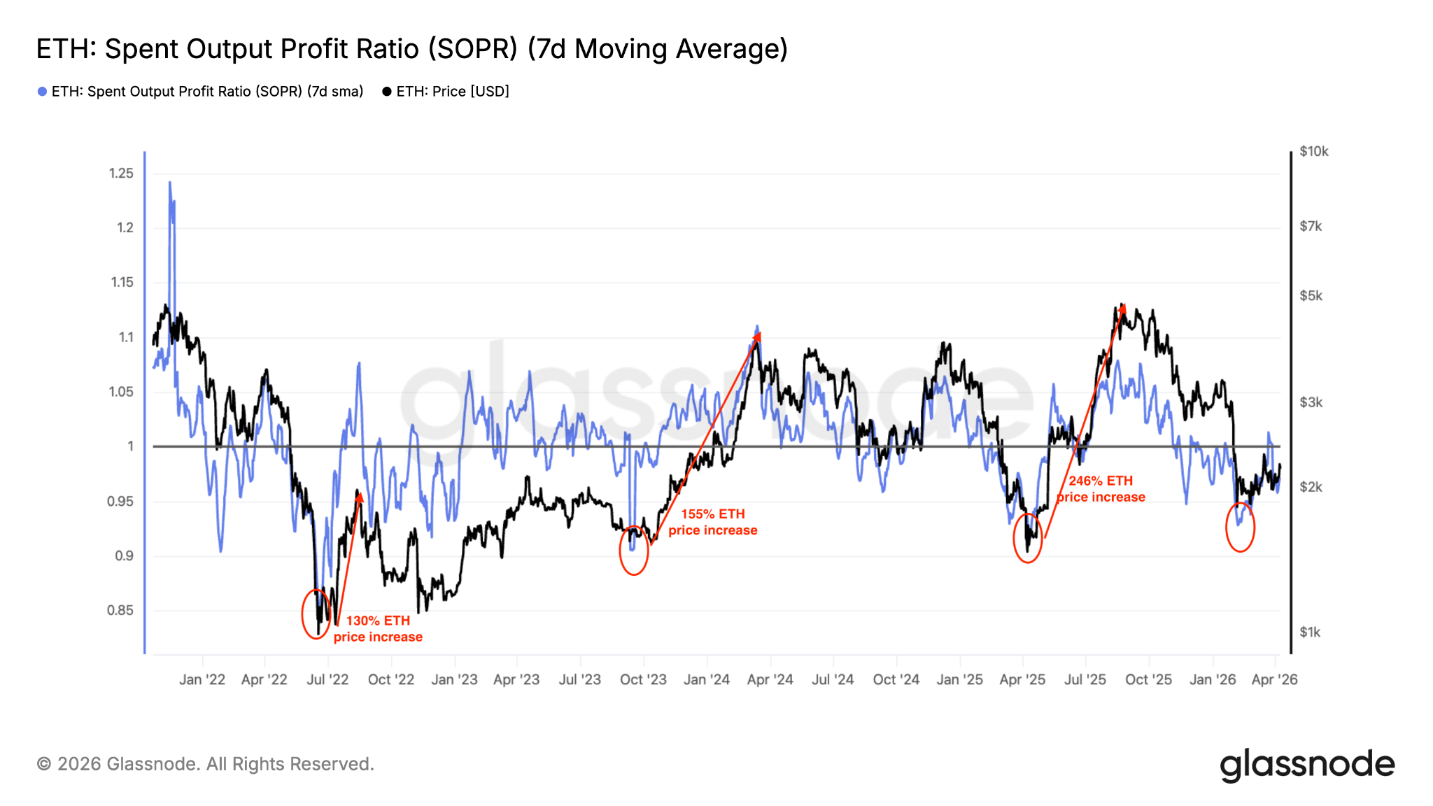 SOPR通过比较代币上次移动时的价值与再次花费时的价值,来衡量已花费ETH输出的盈亏。数值低于1可能意味着市场投降或触底,这或许是买入的信号。