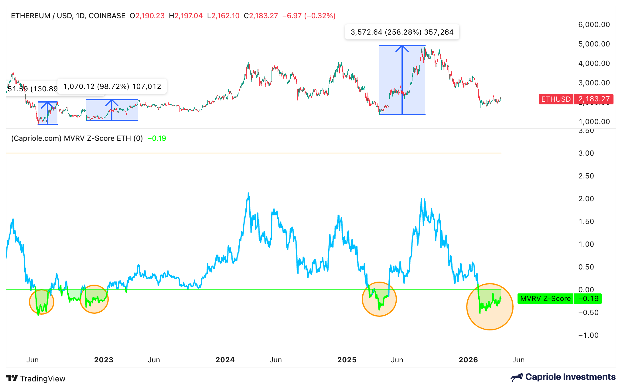 上一次以太坊的MVRV Z分数跌至当前水平是在2025年4月,当时价格下跌了66%。这与1,400美元的宏观市场底部时间点吻合,并开启了长达数月的上涨行情,ETH/USD交易对随后上涨258%,达到当前历史高点4,950美元。