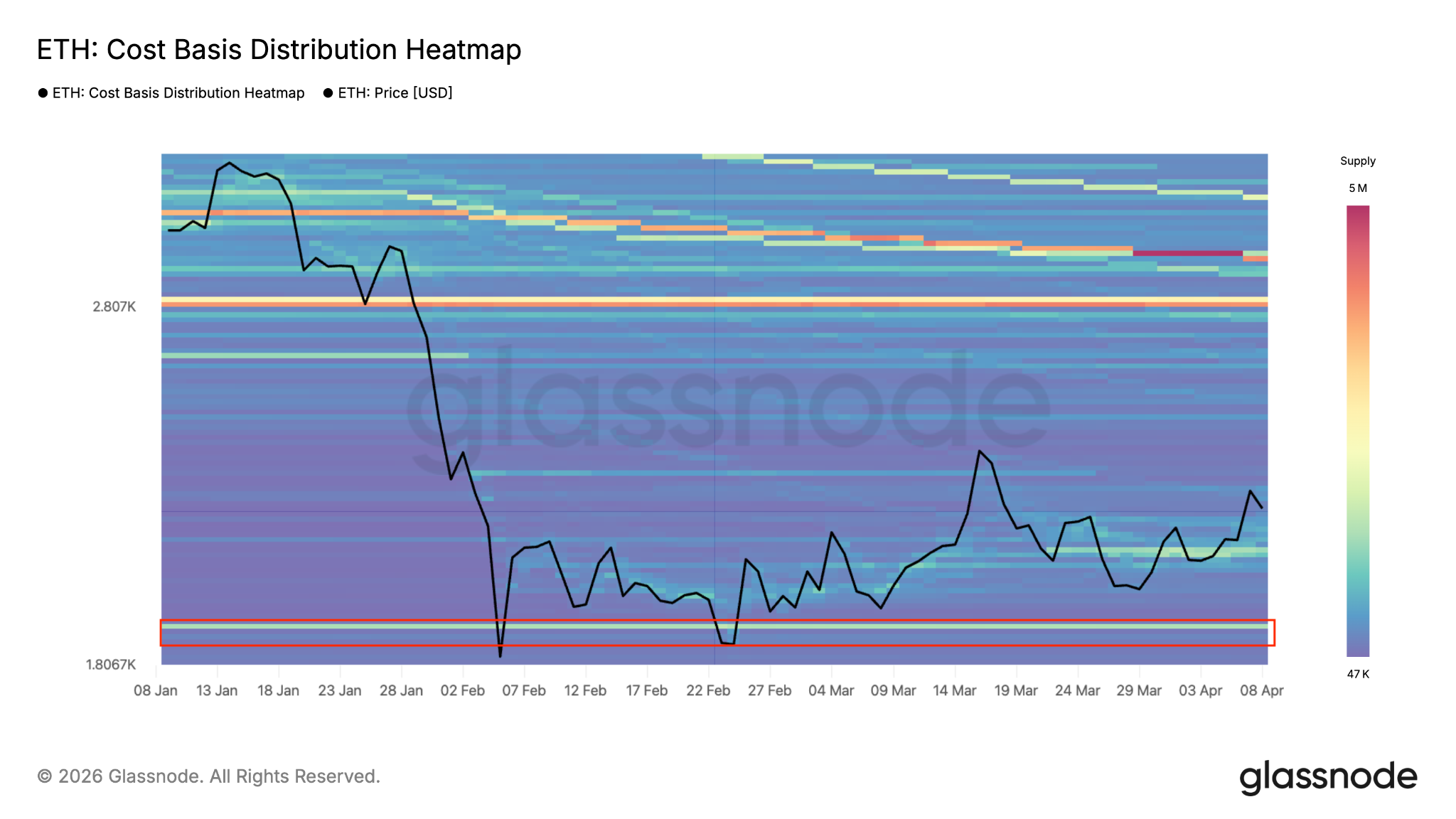 这一区域在1,800美元附近。根据Glassnode的成本基础分布热力图,投资者在此价位附近积累了超过135万枚ETH。