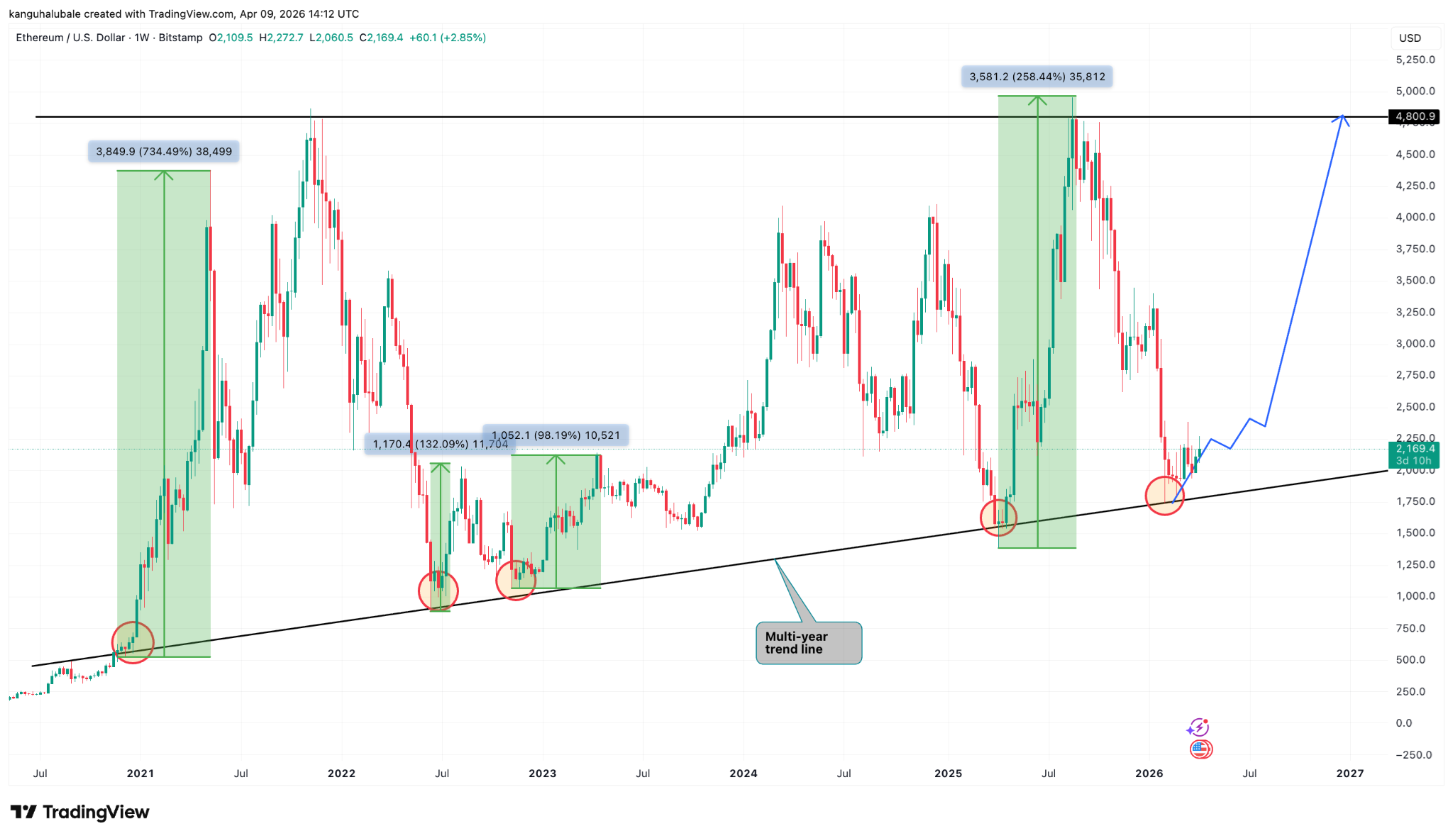 该水平与一条多年来标志ETH/USD底部的趋势线重合,在2022年和2025年4月均可见。