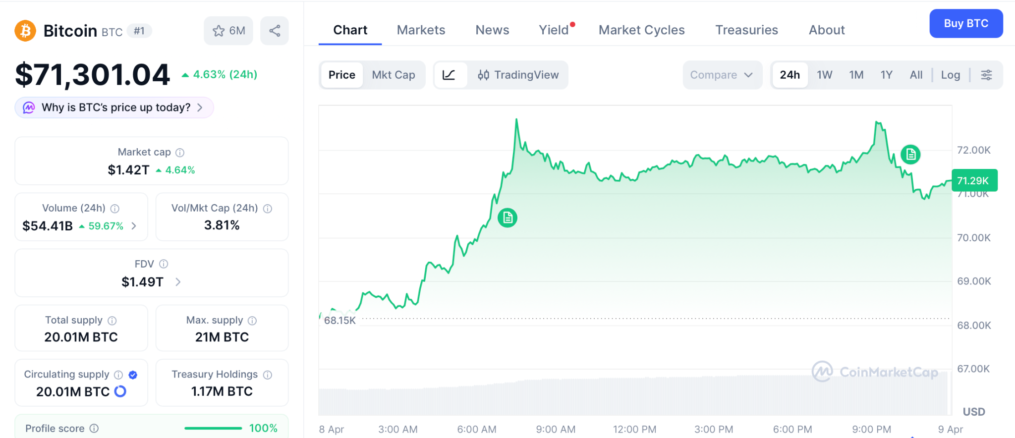 4月8日,随着美国-伊朗停火缓和了通胀担忧,且原油价格自冲突开始以来首次跌破100美元,比特币上涨4.63%至71,301美元。整个加密货币市场总市值也重回2.52万亿美元上方。
