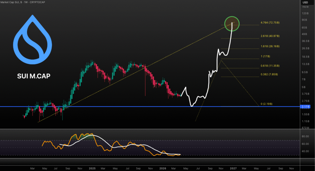 Sui(SUI)可能在跌至20亿美元后,迎来一轮上涨潜力至700亿美元的行情。预计其市值增幅将从低点上涨35倍。交易者应密切关注采用趋势与整体市场状况。