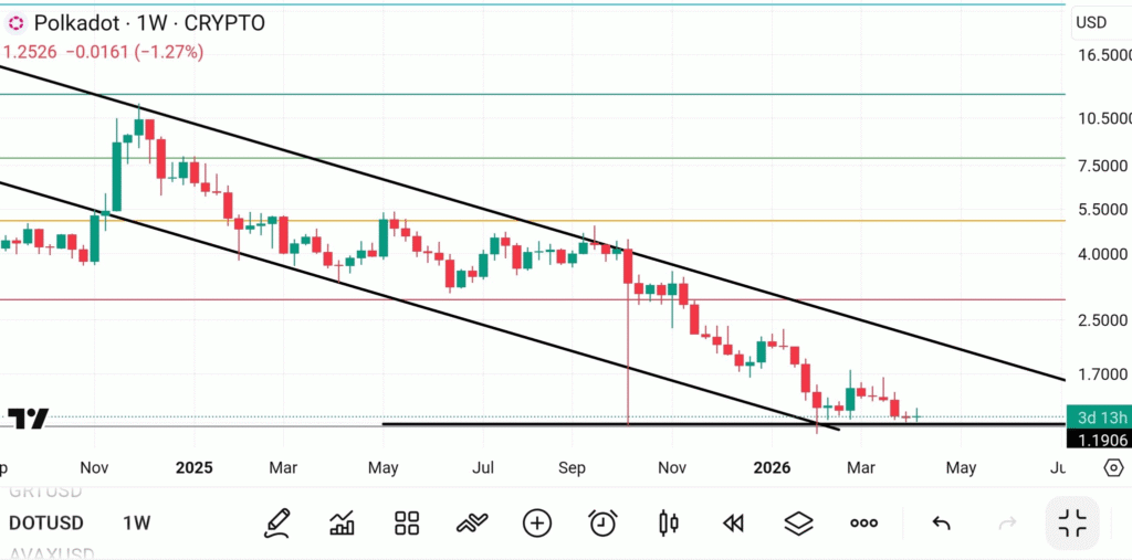 Polkadot正处在重大突破边缘,DOT价格在1.25美元附近徘徊。分析师XRP Captain指出,周线图形态确认了上涨趋势的成立。交易者正关注1.19美元的强劲支撑位,加之山寨币市场情绪升温,暗示DOT可能向10美元的目标位迈进。