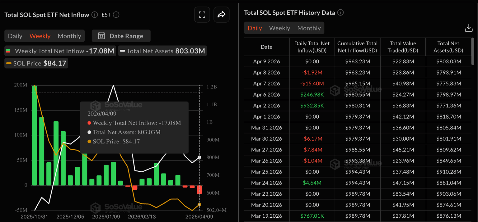 截至4月10日周五,Solana价格维持在83美元附近,成功守住了80美元的支撑位,但未能形成上行势头。该加密货币目前仍受制于其50日、100日和200日指数移动平均线下方,形成了中性偏空的技术格局。