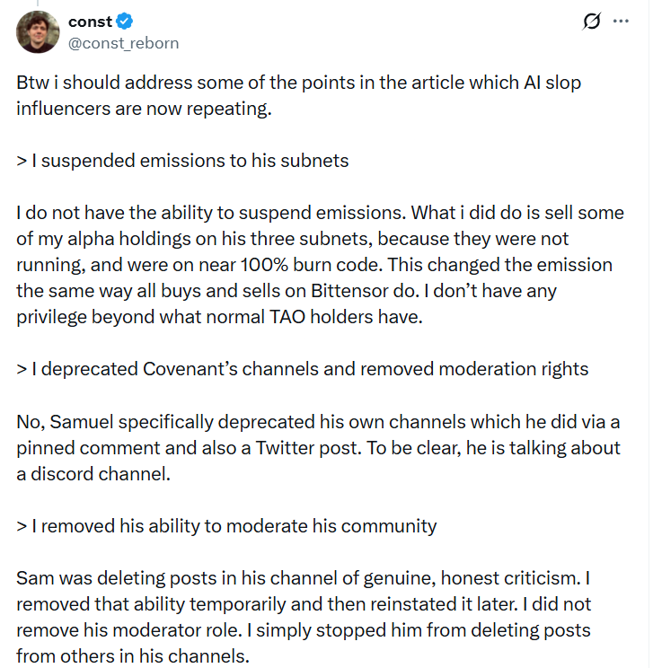 关于剥夺管理权限的指控,斯蒂夫斯表示仅暂时移除了团队删除帖文的权限并已恢复。他补充说,大额代币交易在链上本就可视,并强调:“交易量并不大,不足我投资其团队金额的1%。以我的身份,交易公开性无法避免。我保留买卖代币的权利,而这正是dTao整个体系的基石。”