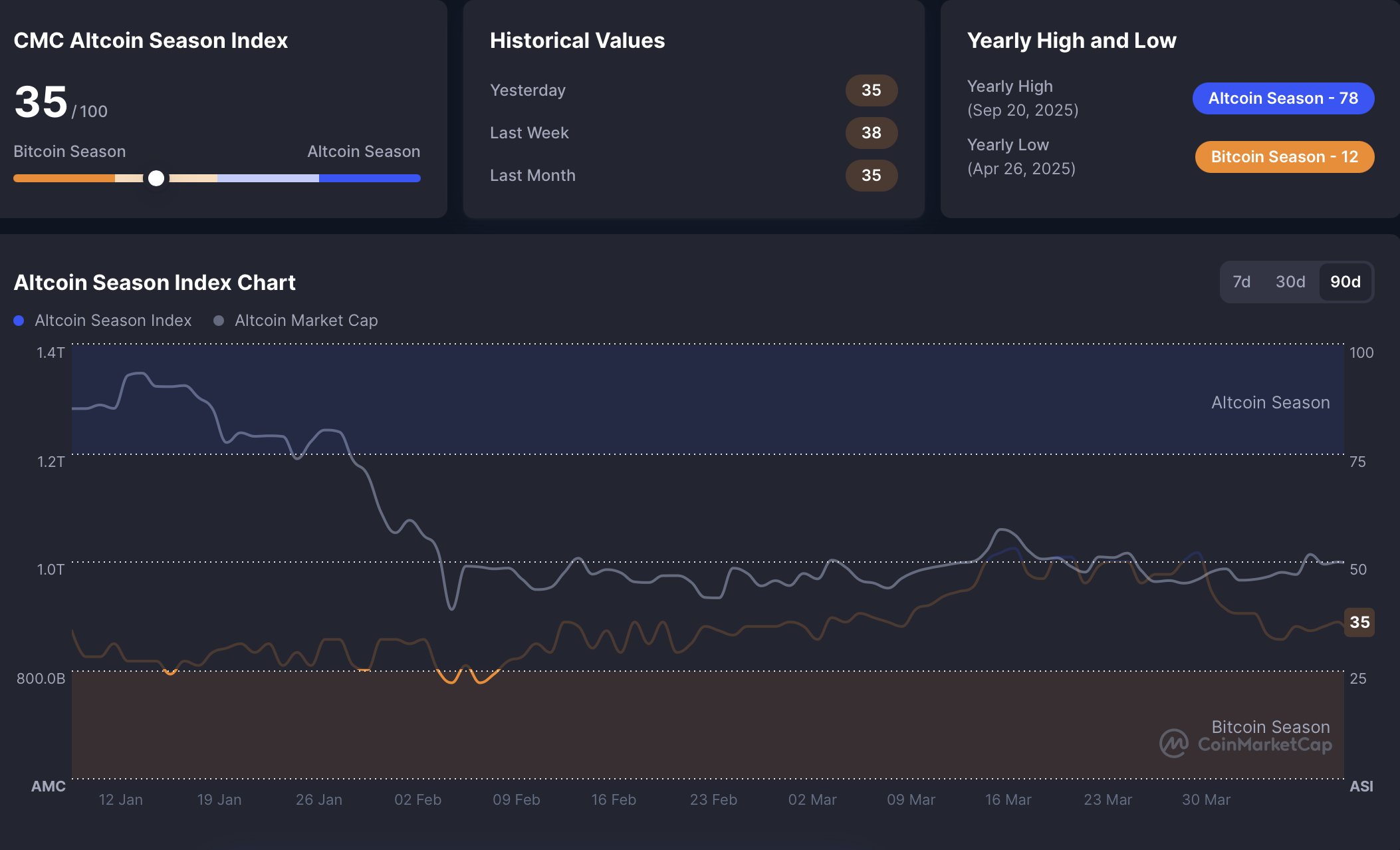 Altcoin Season指数为35/100——比特币表现优于前100名山寨币中的65%。