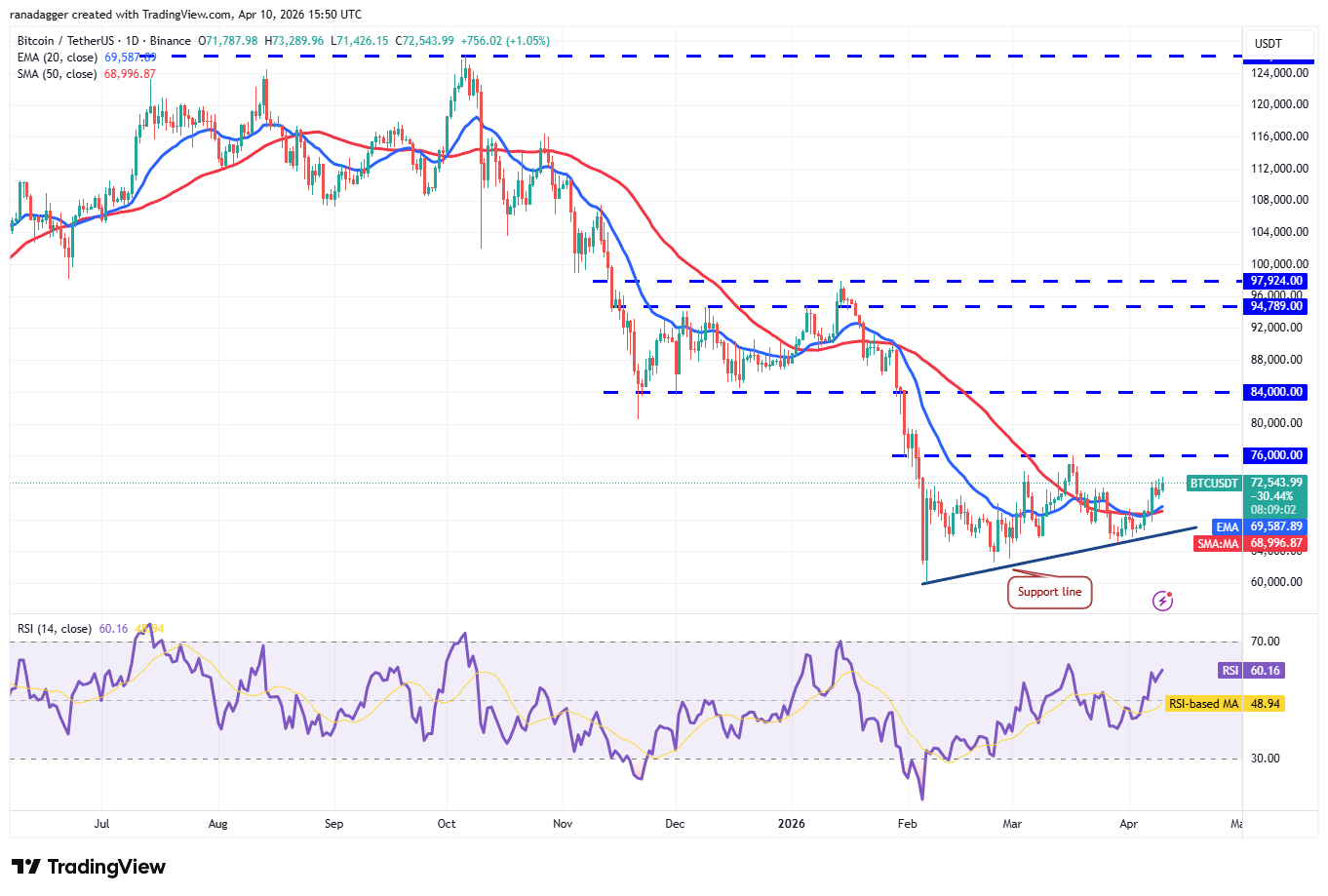 对多头有利的一点是,20 日指数移动平均线已开始掉头向上,相对强弱指数也进入了正值区域。这增加了反弹至 76,000 美元阻力的可能性。