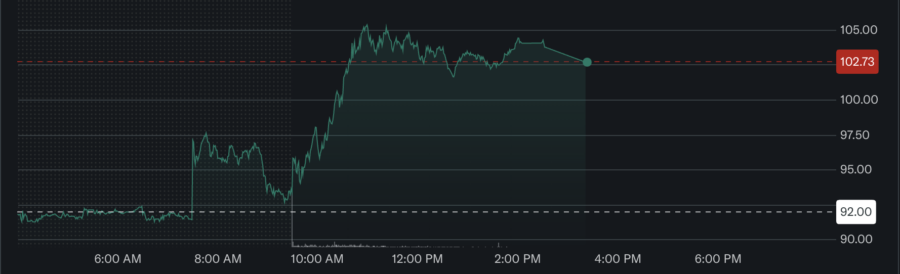 根据CoreWeave的公告,这项协议将分阶段实施,并"具备未来扩展的潜力"。消息公布后,CoreWeave股价当日飙升逾12%,截至发稿时交易价格达102.73美元。