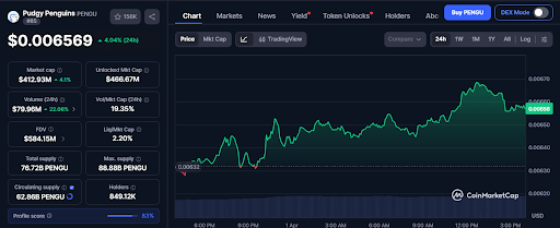 目前,以PENGU为代表的胖企鹅币价格为0.006569美元。该资产的市值约为4.1293亿美元,过去24小时内的交易量约为7996万美元。其价格上涨了4.04%,而交易量则增长了22.06%。