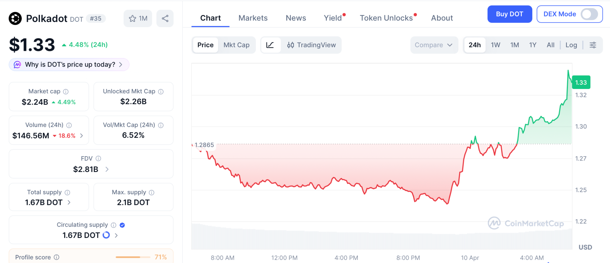 据CoinMarketCap数据,4月10日DOT交易价格为1.33美元,较55美元历史高点下跌98%。首只美国波卡现货ETF于3月上市,3月14日生效的排放量削减计划将新供应量削减53.6%。当前阻力位1.40美元,支撑位1.15美元。技术实力虽强,但从1.33美元回升需要数月资金积累,而非单次上市事件所能推动。