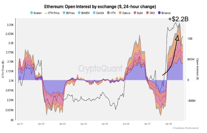 区块链情报平台CryptoQuant的数据显示,在停火声明发布后,以太坊以美元计价的未平仓合约立即录得惊人的22亿美元流入。这一激增将未平仓合约推至近四周未见的高位。