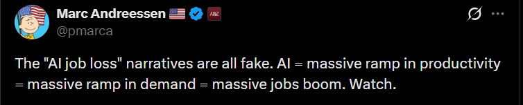3月6日,风险投资家兼网景公司联合创始人马克·安德森在X平台上表示,对AI导致失业的担忧被夸大了。