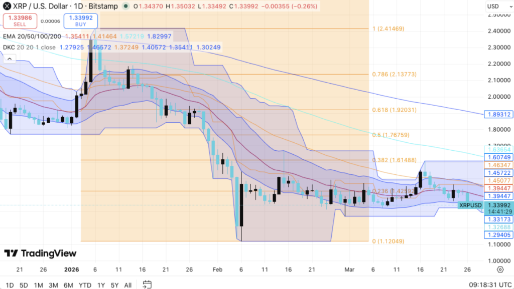 1.30美元至1.34美元之间的支撑区域持续吸引买盘兴趣,并防止价格进一步深跌。若跌破该区域,可能将XRP推向1.20美元,并进而考验1.12美元水平。