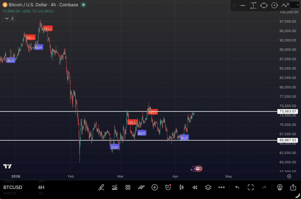 分析师标注了关键买入信号以及市场结构从更低高点向更高低点的转变。确认反弹的即时条件是日收盘价站上7.5万美元。在此之前,4小时时间框架内的下跌趋势已被视为打破,动能已转为看涨。