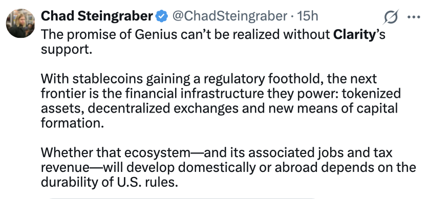 Web3游戏巨头Immutable创始人罗比·弗格森在4月3日即数日前表示:“《清晰法案》将使过去十年游戏行业的增长相形见绌。”周五,Coinbase首席执行官布莱恩·阿姆斯特朗(其公司在今年1月撤回了对《数字资产市场清晰法案》的支持)称这项拖延数月的立法“已到通过时机”。