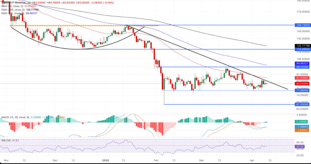 从技术角度看,Solana在下行趋势线及50日指数移动平均线(约87美元)附近面临强劲阻力。该区域持续限制上行空间,多次突破尝试均未成功。此外,若收盘价能决定性突破此阻力位,则可能打开通往100美元附近更高阻力区域的道路。