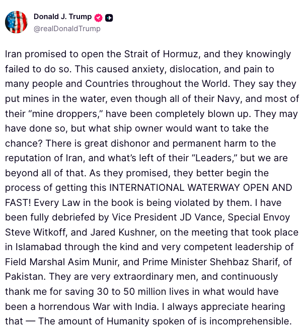 他在Truth Social发帖称:“任何支付非法通行费的船只都无法在公海上获得安全通行。”后续帖子重申要求伊朗全面开放这条重要的石油运输通道。