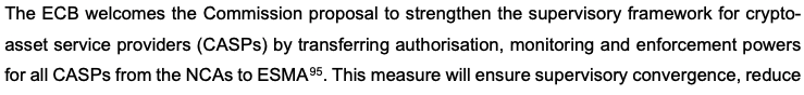 欧洲央行表示,将针对所有CASP的“授权、监督和执法权力”从各国监管机构转移到ESMA,将“确保监管的一致性,减少加密货币市场中的碎片化并降低跨境风险,从而支持金融稳定和单一市场的完整性。”