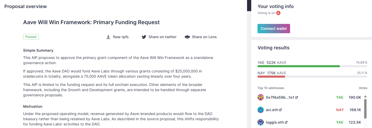 Aave Labs作为Aave协议的核心开发团队,在其去中心化自治组织(DAO)的“Aave必胜”框架下,获得了2500万美元稳定币拨款以及75,000枚AAVE代币的分配。该提案于周六以近75%的支持率获得通过。根据治理数据面板显示,稳定币拨款将分12个月发放,而75,000枚AAVE代币将在四年内线性解锁。