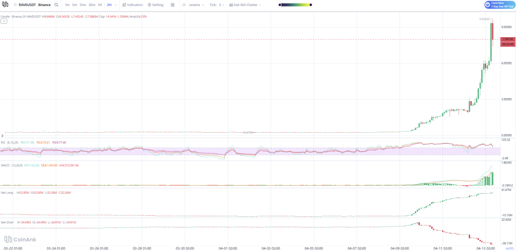 RAVE/USDT的2小时币安图表揭示了爆发性动量与极端风险并存的故事。价格从近3美元的低点冲高至9.66666美元,随后回调至截图时的7.99美元。短短两小时内波幅达24.23%,这绝非正常交易,而是典型的轧空行情。