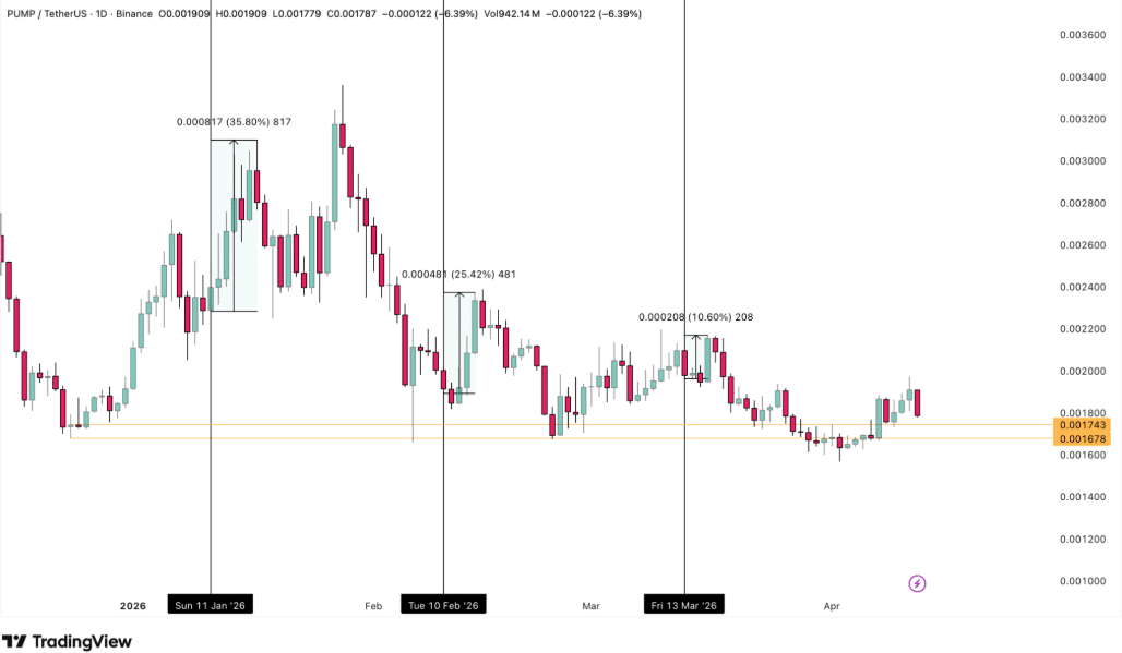 但更长期的数据描绘了更悲观图景:PUMP自1月峰值以来已下跌42%,这凸显代币解锁后的初期上涨可能伴随持续的抛压。