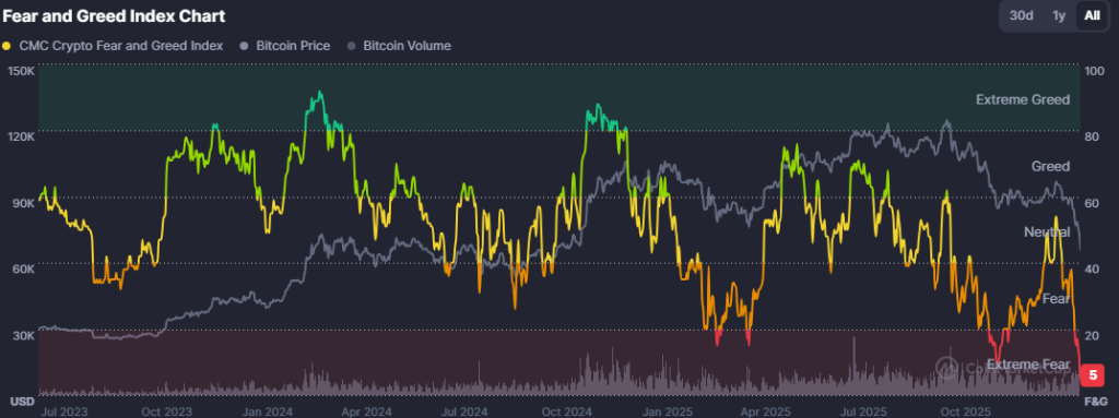 市场情绪数据进一步佐证当前山寨币暴跌由恐慌驱动。加密恐惧与贪婪指数骤降至5,明确落入“极端恐惧”区间。该指数低于10的情况在过往周期中仅出现数次,包括2018年、2020年3月及2022年末。