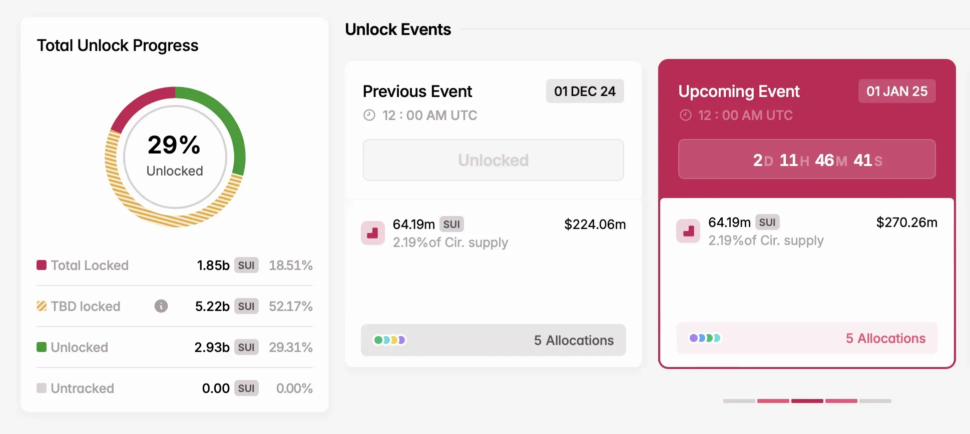 SUI本周将进行大规模代币解锁。1月1日,该协议将解锁代币,当前流通量为29.2亿。即使在此次大规模解锁后,绝大多数代币仍将保持非流通状态。