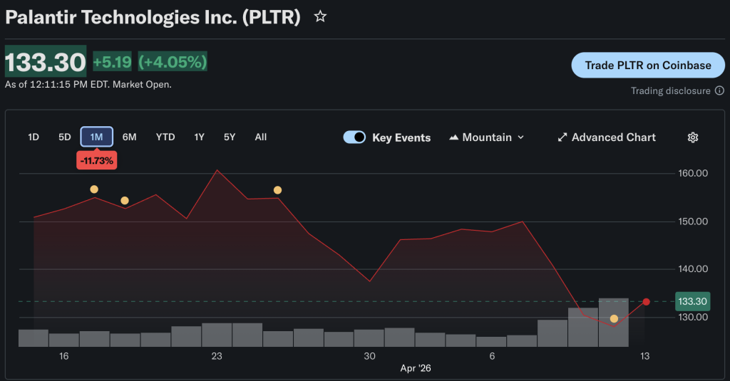 截至2026年4月中旬,Palantir Technologies (PLTR)交易价格约为92.50美元,低于52周高点125.41美元,高于20.33美元的低点,市值接近3200亿美元。