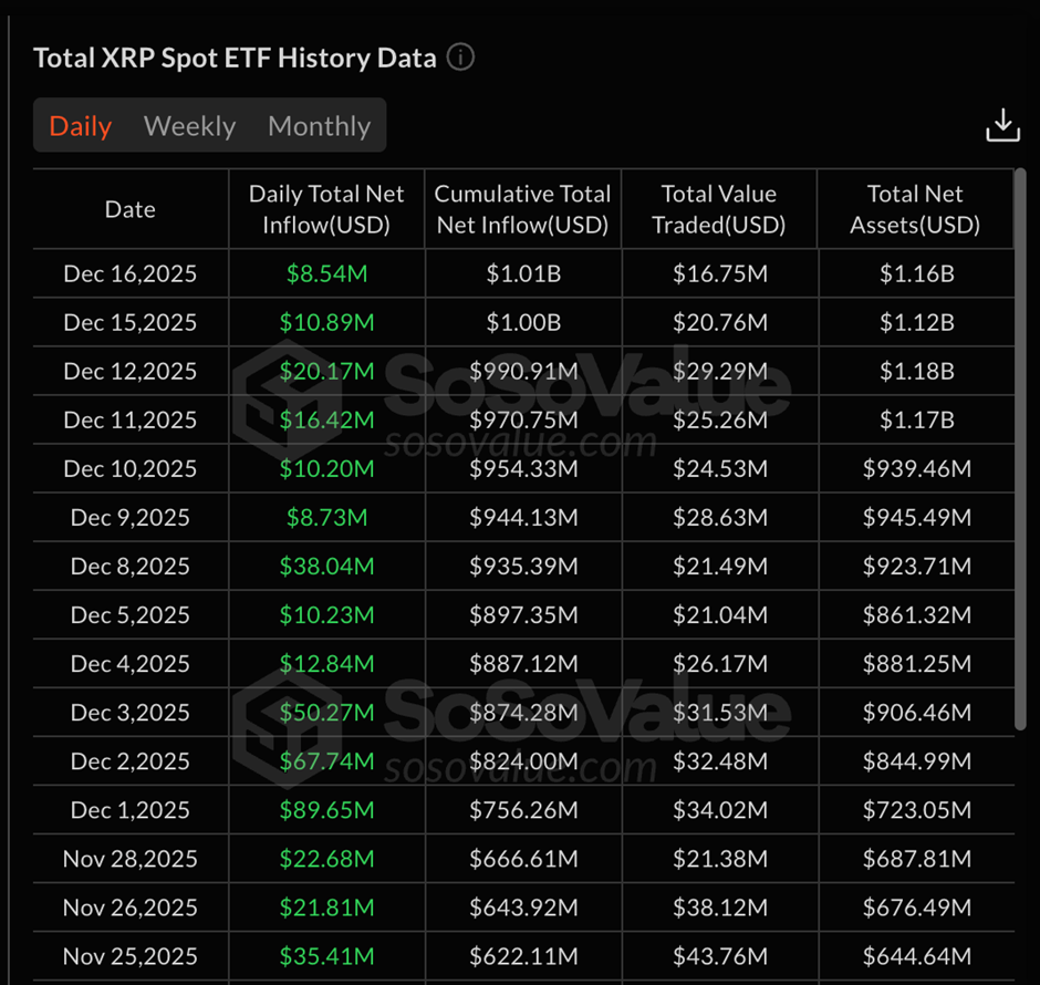 维持当前局面的积极因素在于:持续的资金流入表明长期配置需求依然存在,这解释了为何价格能坚守支撑区域而未出现溃败。若XRP能持续维持在1.92美元上方震荡整理,将有助于消化抛压并为多头蓄势创造条件。