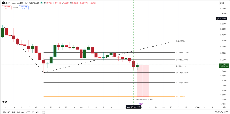 XRP价格预测显示,若跌破1.92-1.90美元支撑区域,可能面临20%的跌幅。