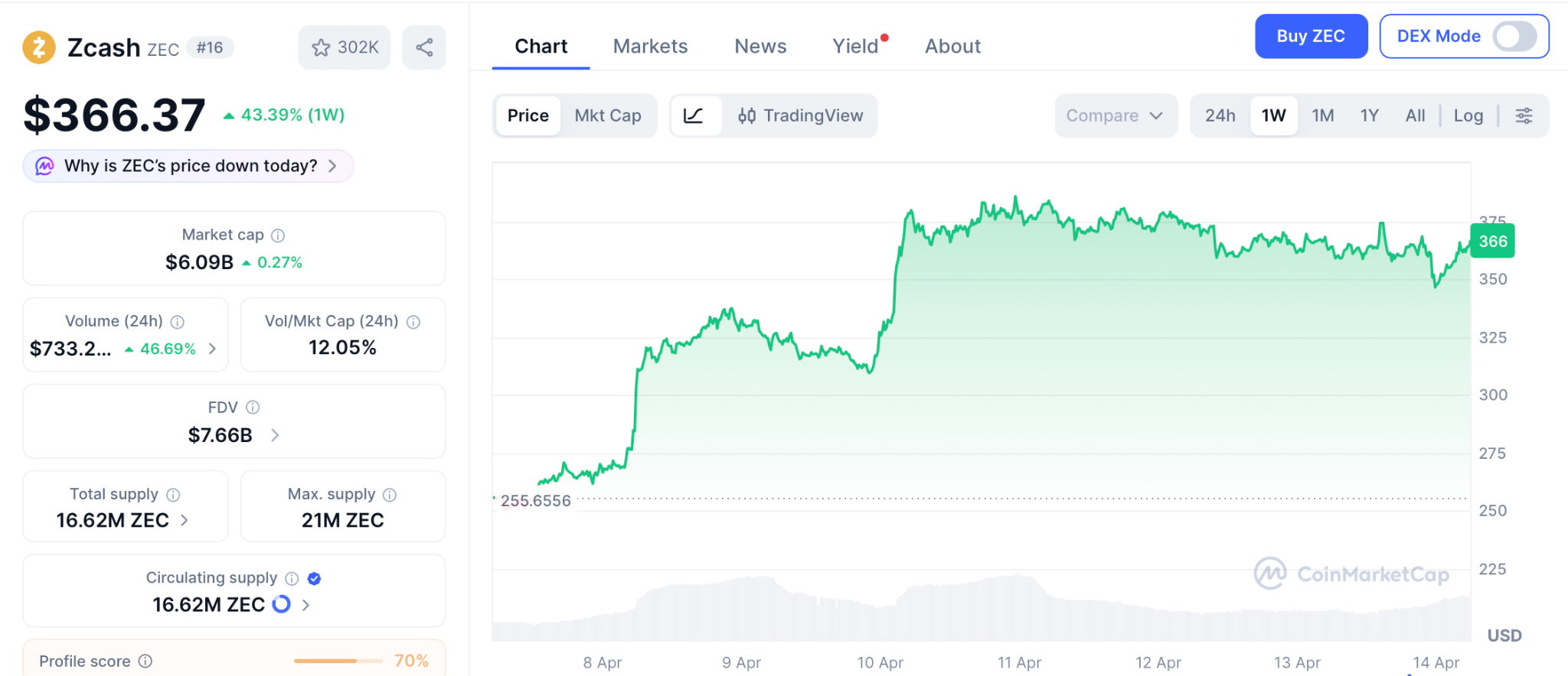 Zcash在一周内上涨43.39%后,在366美元的价格是好的买入选择吗?