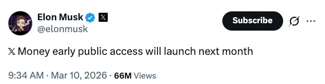 尽管如此,马斯克曾在三月宣布X Money将于四月正式上线。
