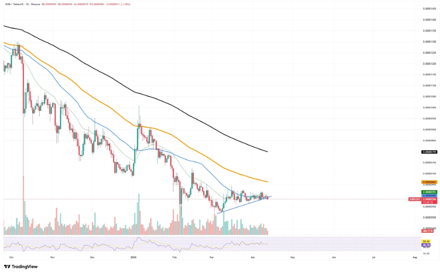 看跌的移动平均线和中性RSI状况表明没有立即复苏的信号,柴犬币可能进一步下跌至更低的支撑位。