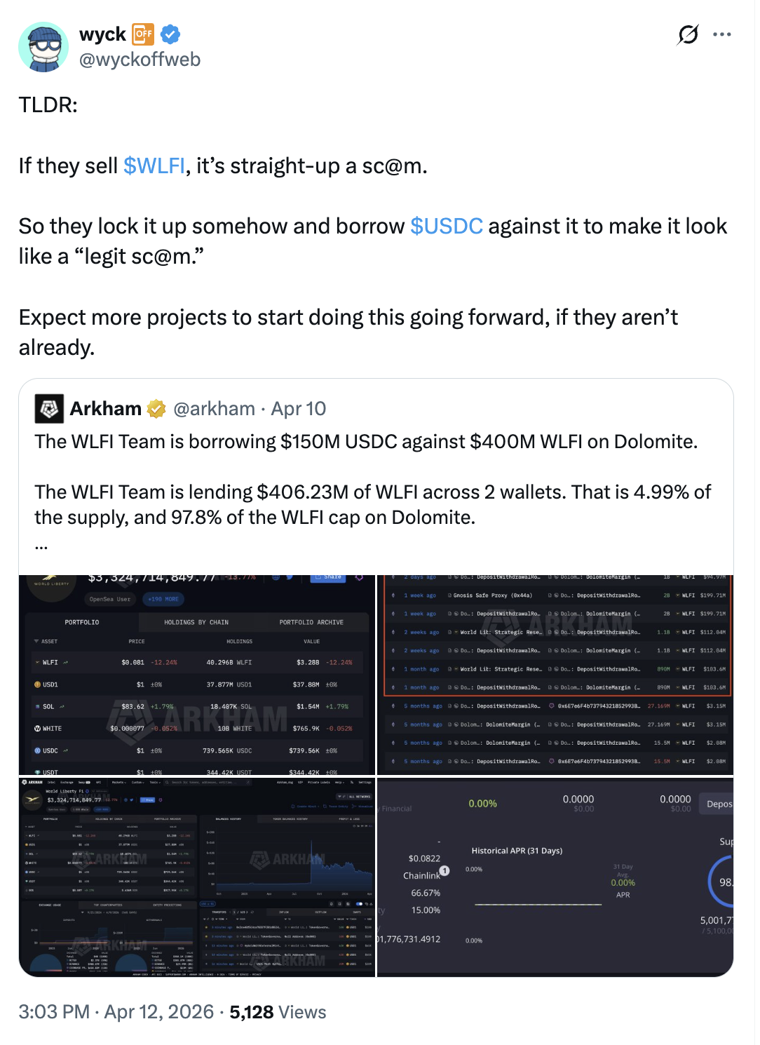 该结构风险较高,因其使用交易稀少的内部代币借入真实流动性,这意味着WLFI价格若大幅下跌,可能导致储户被困、引发坏账并加剧抛售压力。